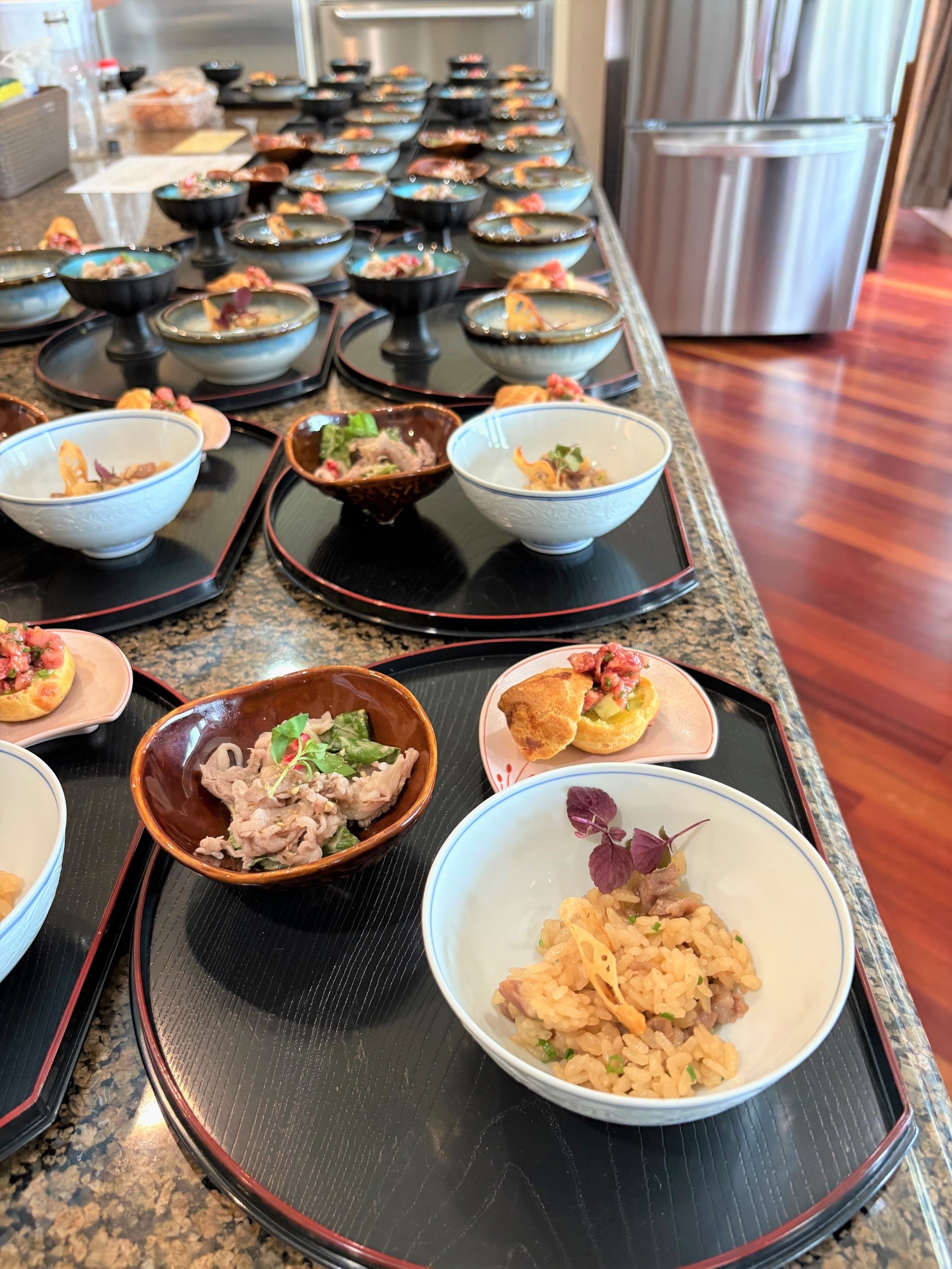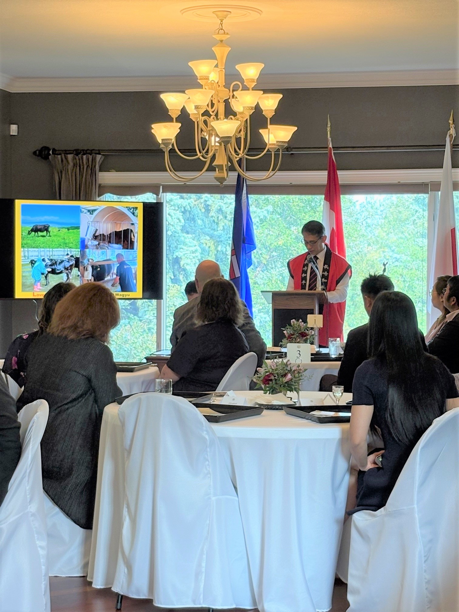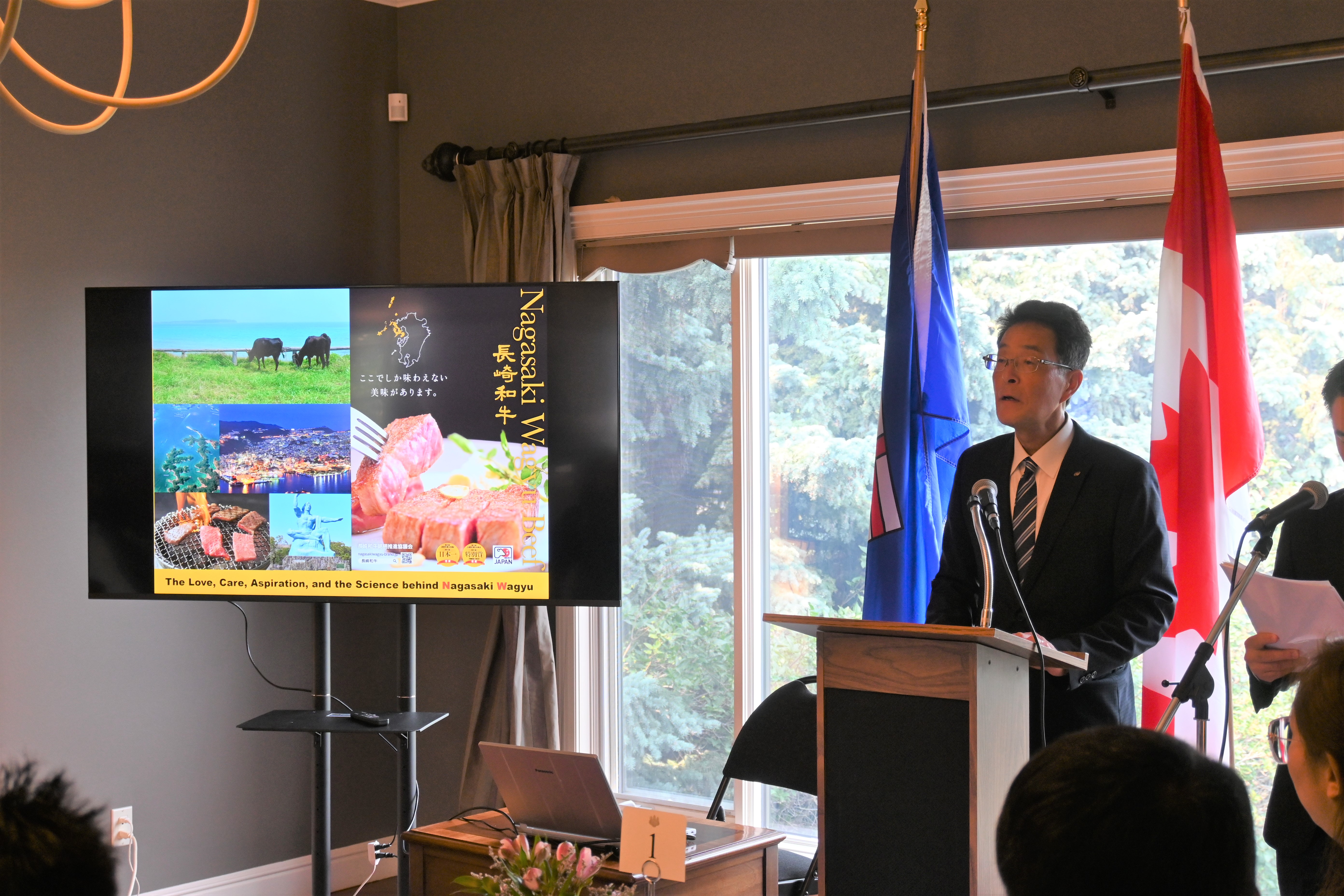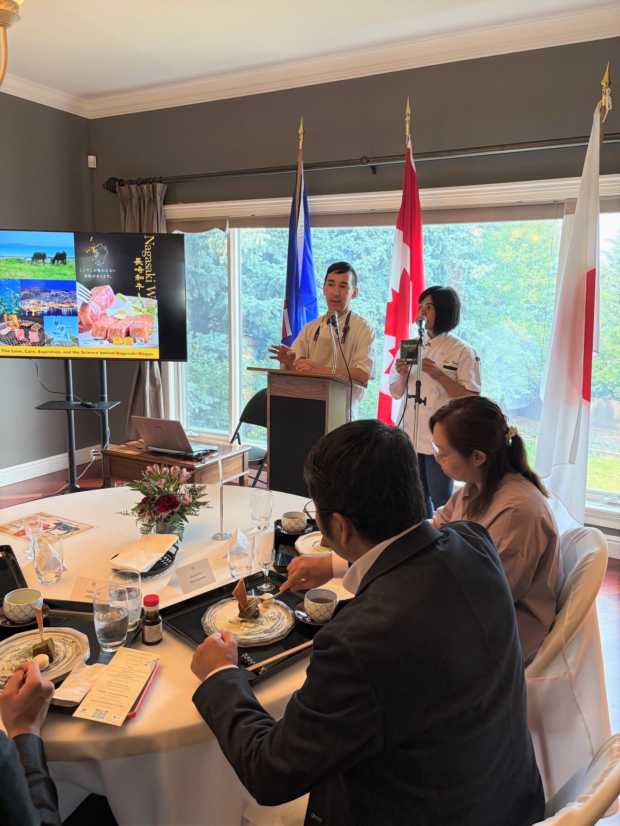 長崎和牛銘柄推進協議会は長崎和牛の歴史や特徴についてプレゼンテーションを行い、その後、新たに公邸シェフに就任した尾山圭介氏とカルガリー在住のシェフ、カラヤ・ガムクム氏の2名による長崎和牛を使用した料理3品が提供され、ゲストは料理の説明や長崎和牛に関する説明を聞きながら、料理を試食しました。