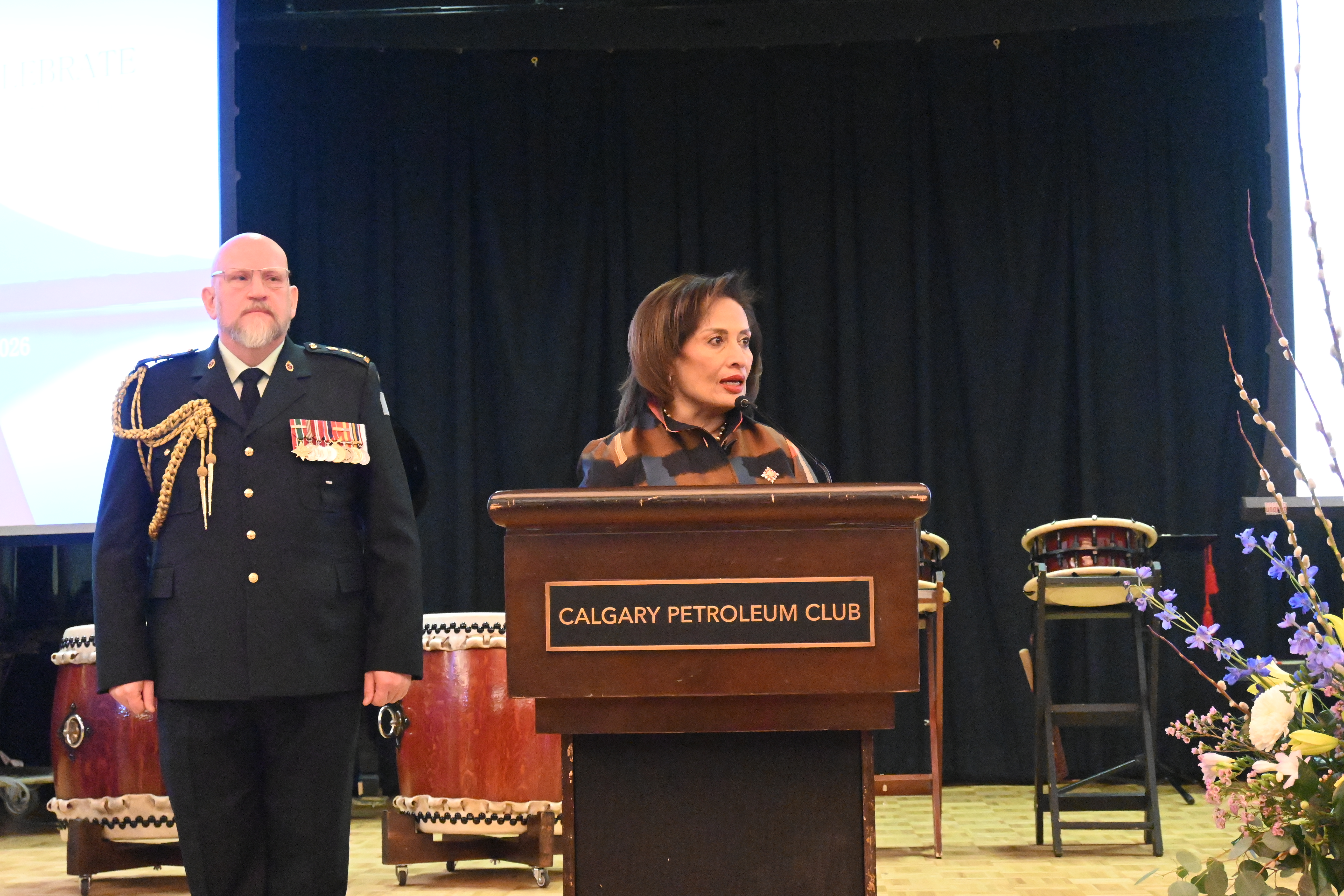 続けて、サルマ・ラカニ・アルバータ州総督、リック・マカイバー・アルバータ州議会議長による祝辞、および総領事による挨拶が行われ、その後、サルマ・ラカニ・アルバータ州総督と総領事による乾杯が行われました。