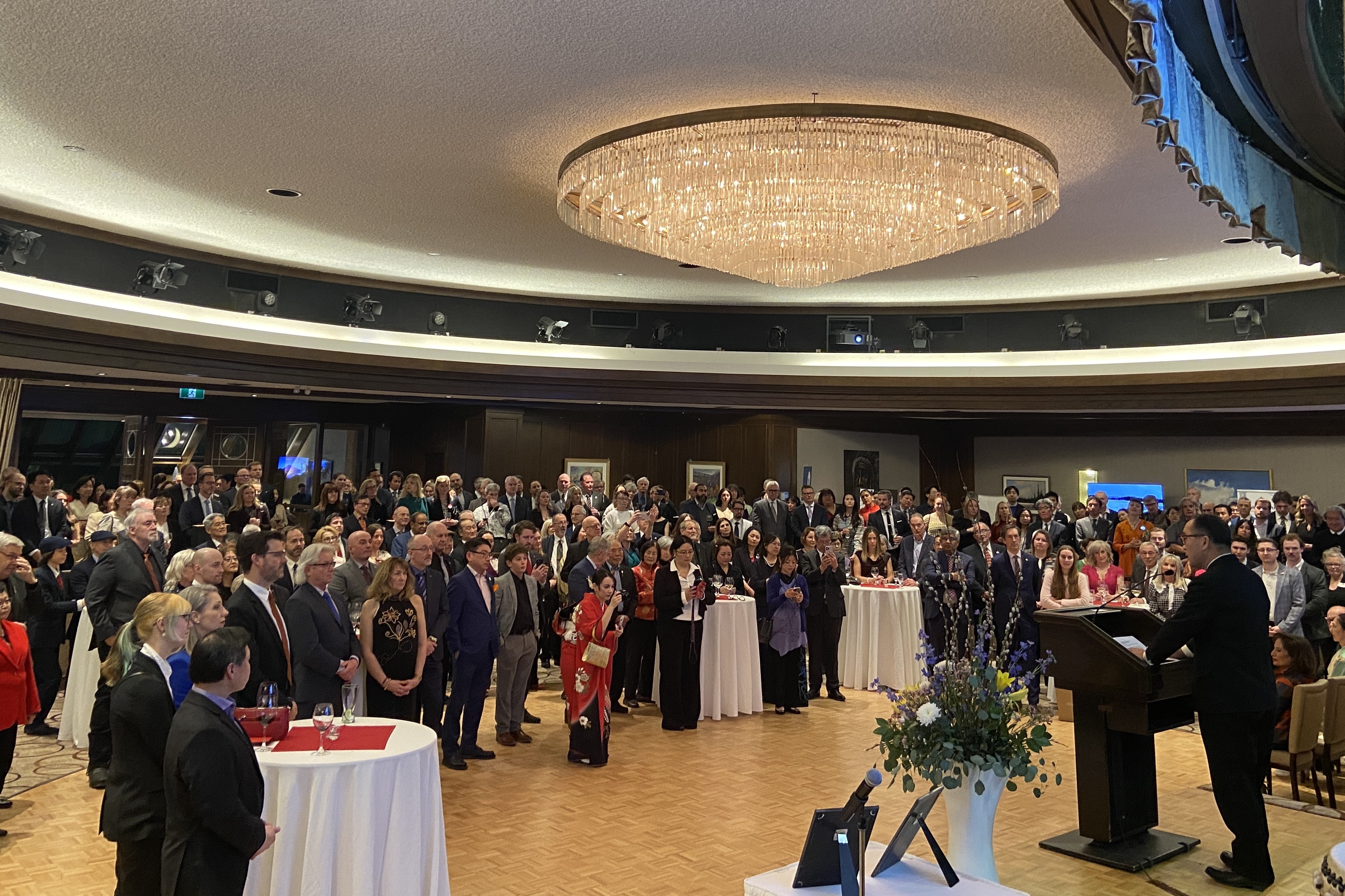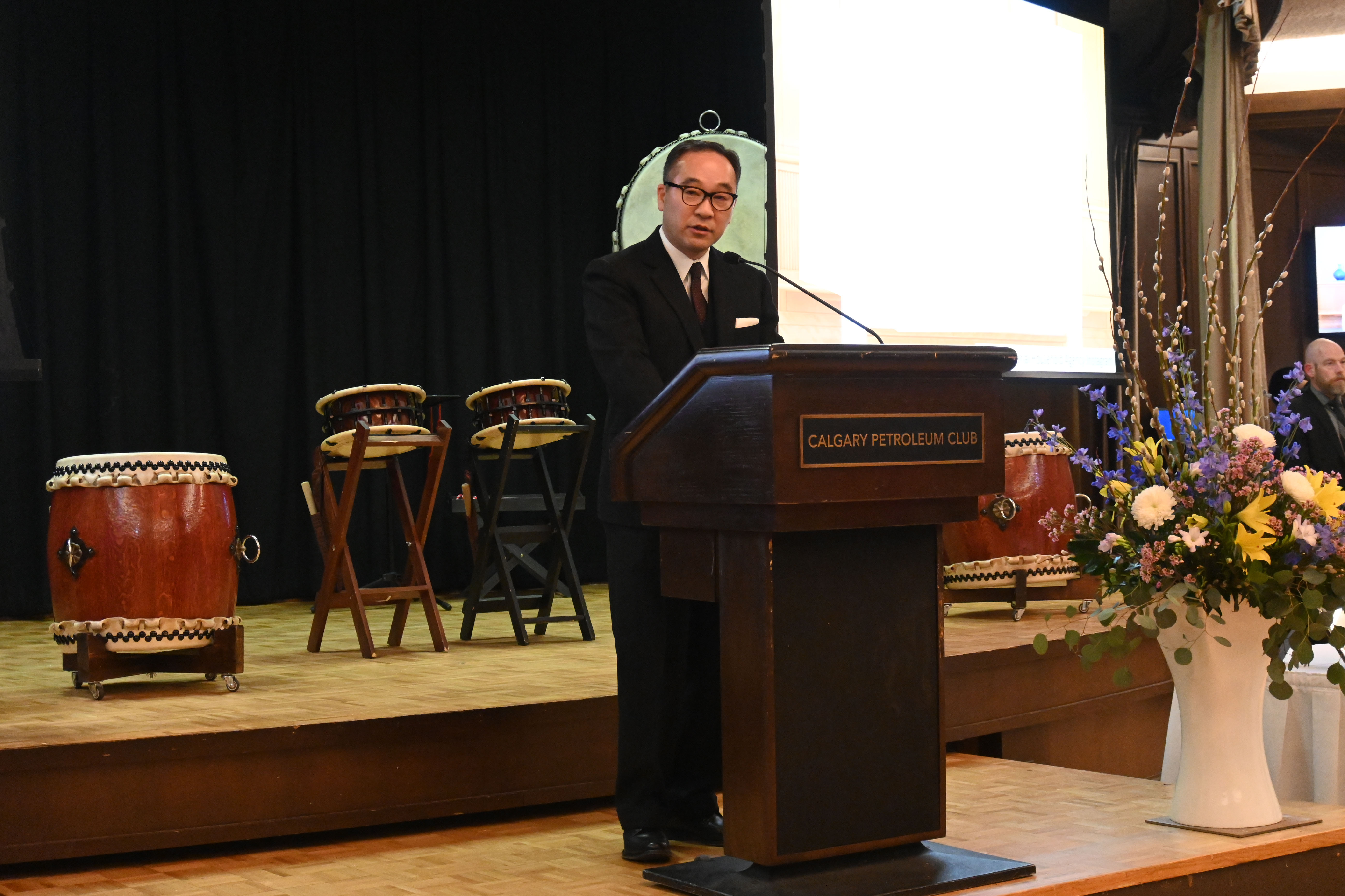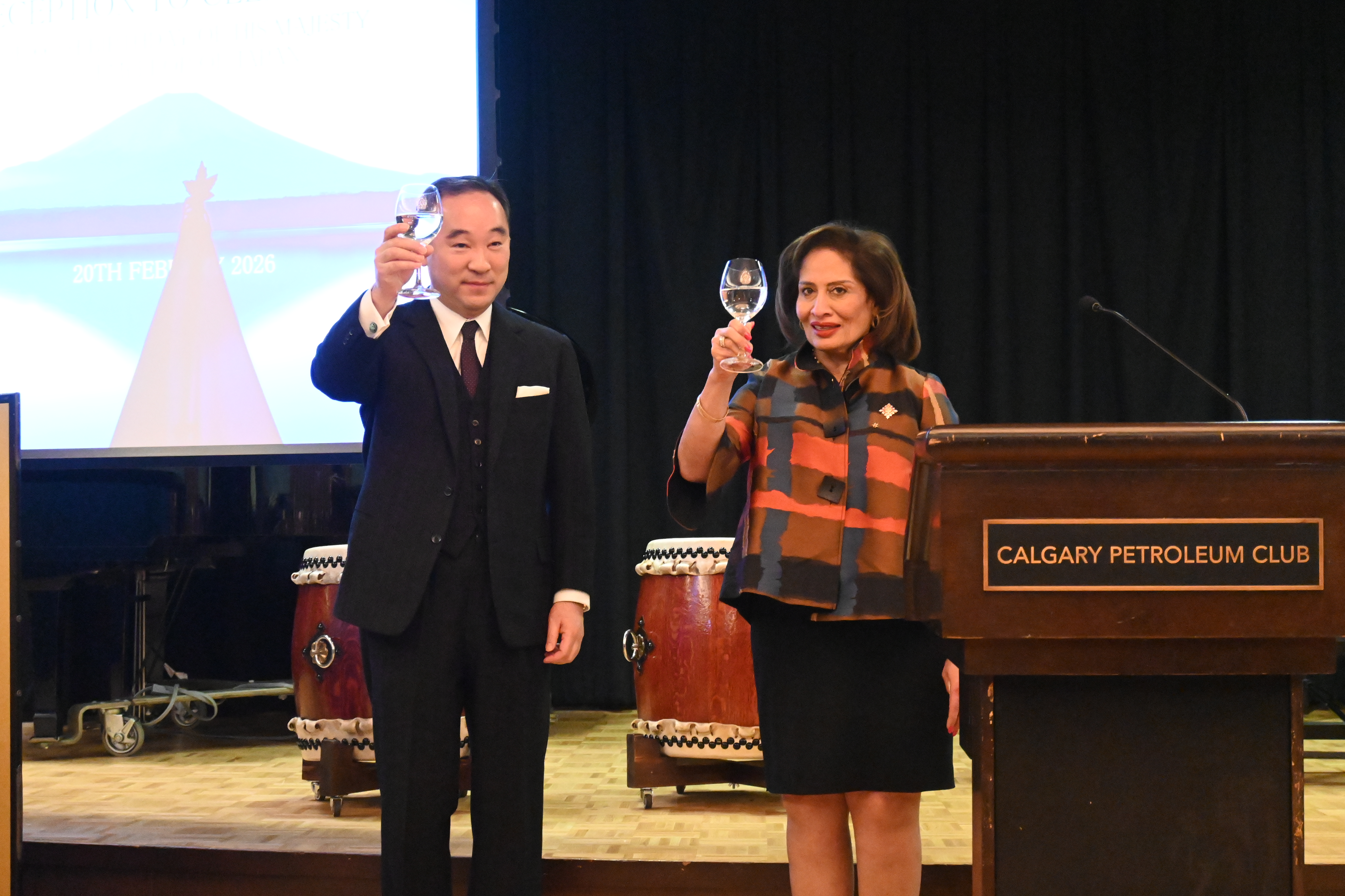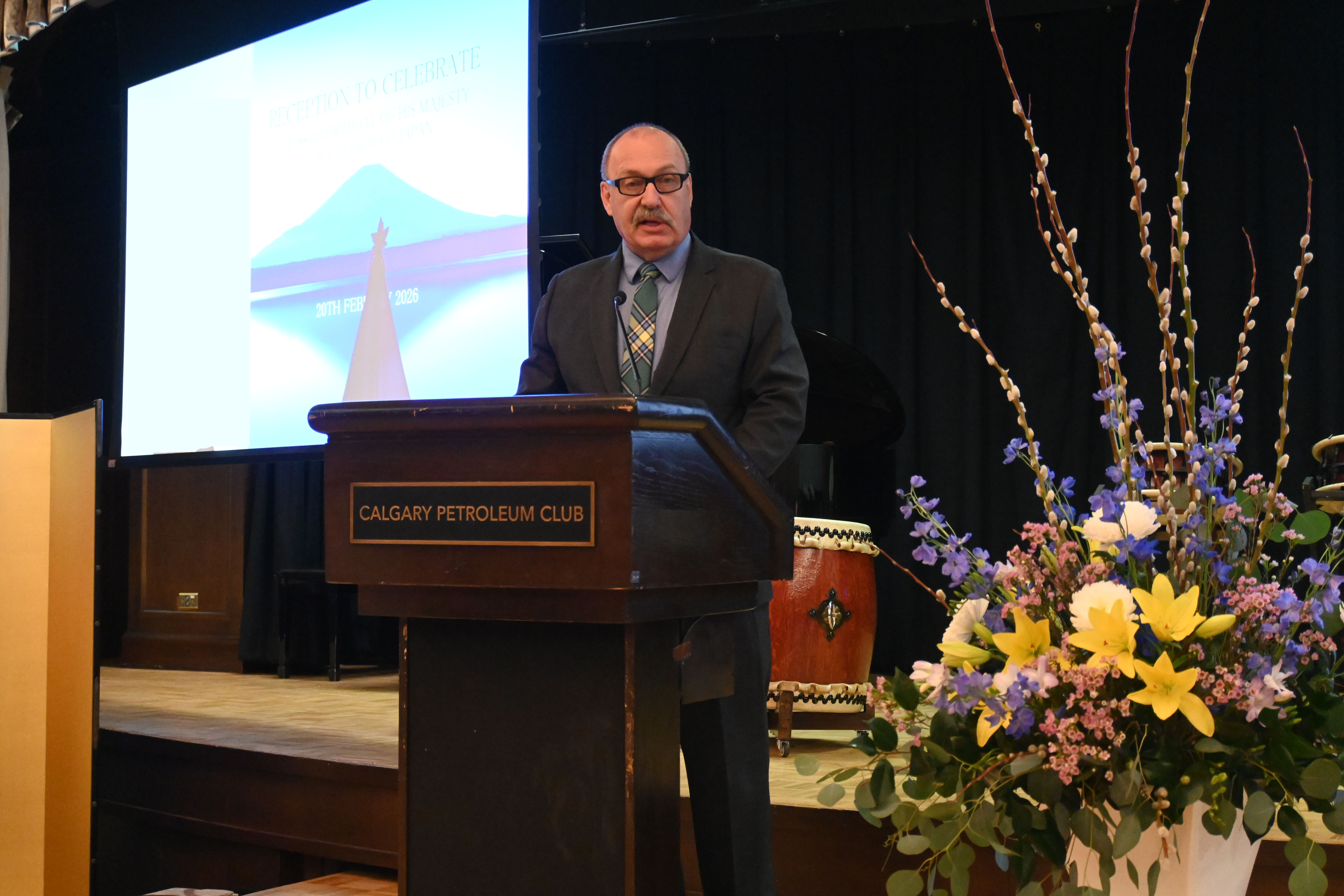 2月20日、倭島総領事はカルガリー市内において天皇誕生日祝賀レセプションを開催しました。会場には、サルマ・ラカニ・アルバータ州総督、リック・マカイバー州議会議長をはじめとする当地政府・議会関係者、ビジネス・文化・教育関係者など、約340名の方々が出席されました。