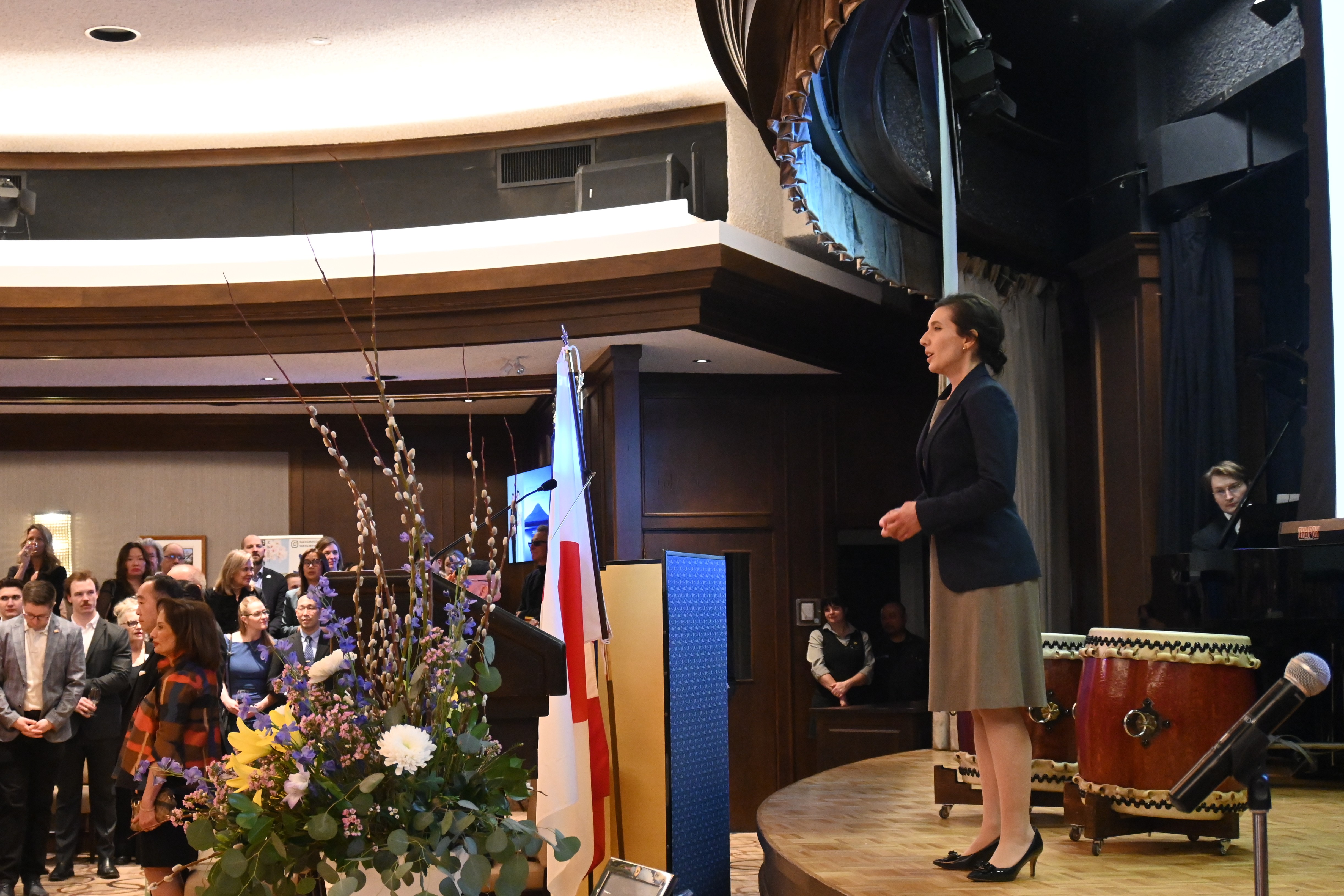 同レセプションの開会に先立ち、ミッドナイト太鼓による演奏が行われました。開会後、カルガリーオペラによるカナダ国歌「オー・カナダ」及び日本国歌「君が代」が披露されました。